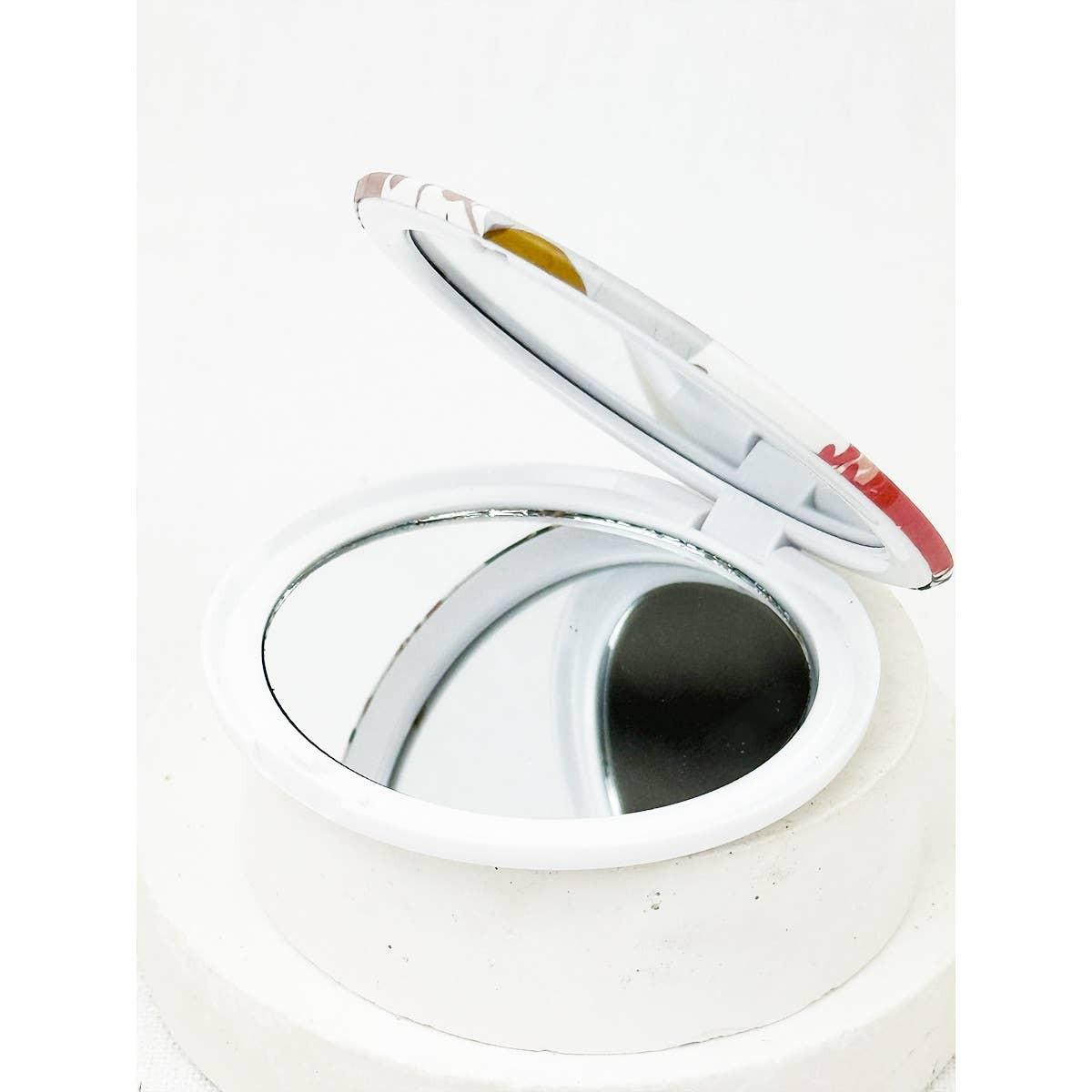 Elegant Tropical Leaf Print compact mirror -The fashionable round foldable makeup mirror use electroplating process to ensure no fading.The mirror itself has 1 regular and 1 magnifying mirror to suit all purposes. -Dimension- 3 Inch Radius