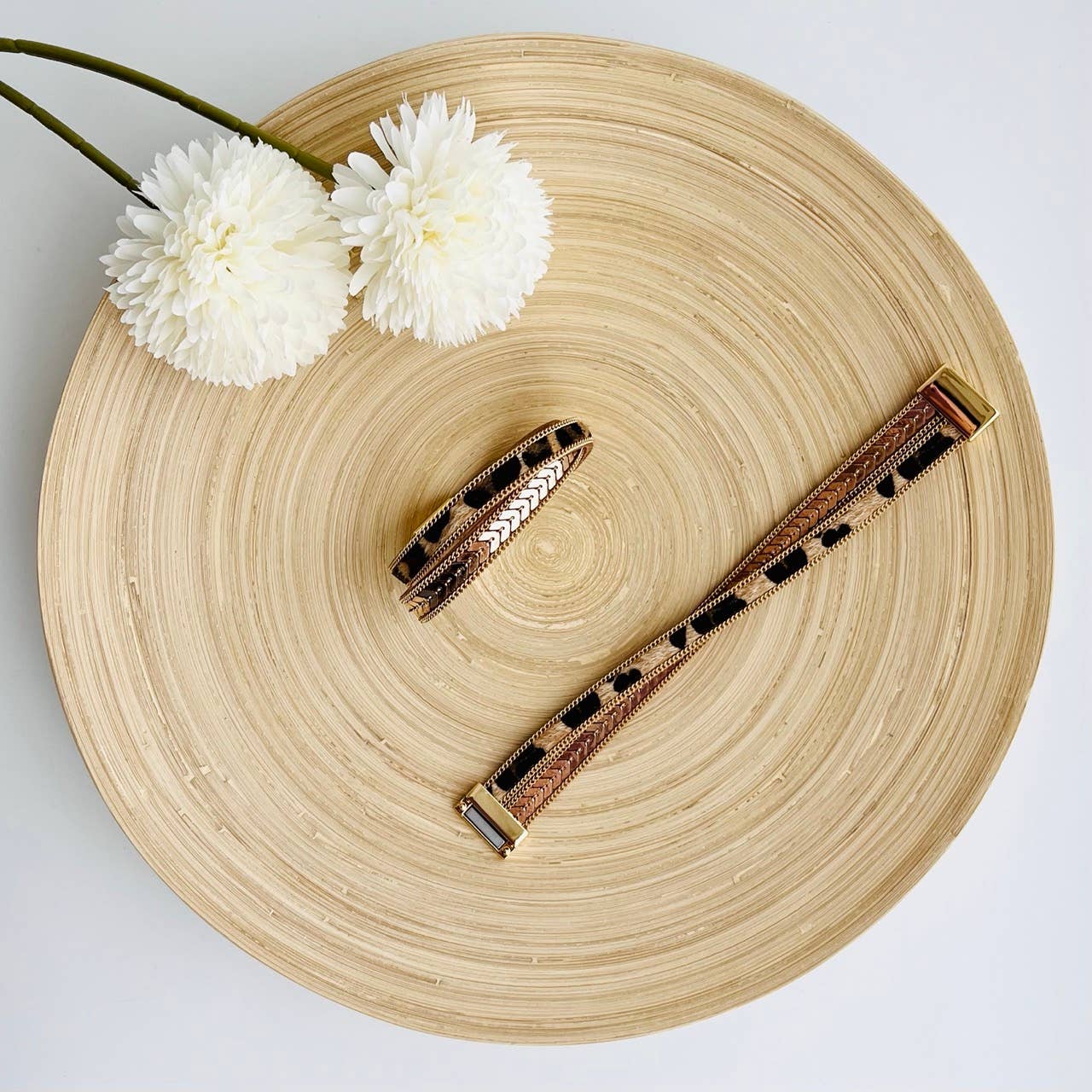 BOHO STRAPPY LEOPARD bracelets are a great addition to any woman's wardrobe. The bangles are neutral colors, and are perfect for any season and any occasion. There is an easy-to-wear magnetic closure. The Cheetah print material is textured. Great stocking stuffer for teens and women.