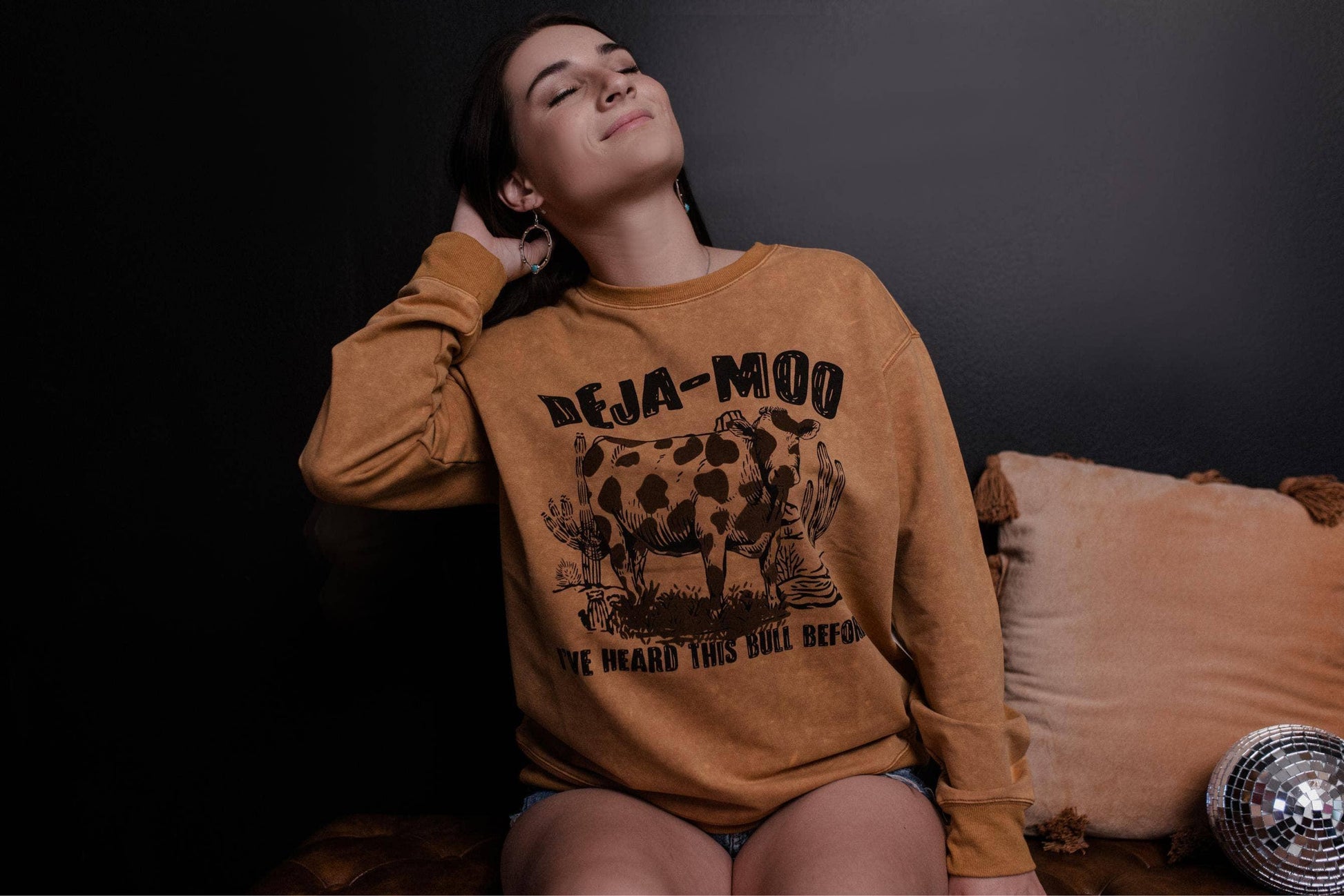 Make a bold statement with our Deja Moo oversized graphic sweatshirt. Designed with a relaxed fit and cozy fabric, it’s perfect for casual nights out, weekend errands, or just lounging at home. The eye-catching bull graphic adds a playful twist to your wardrobe while keeping you stylish and comfortable.